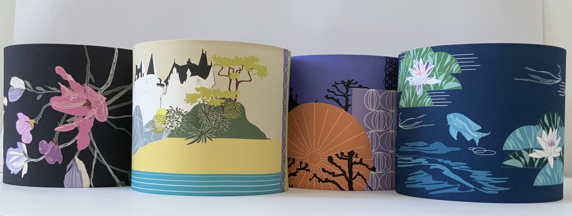 As an extension of my activities as a textile designer I have developed a collection of colourful handmade lampshades and cushions featuring my illustrations. Printed on organic cotton, the illustrations set stylish accents in interiors featuring geometric patterns or hand-drawn botanical and nature inspired designs.